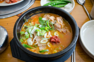 Kimchi (Korean: 김치) is a traditional Korean side dish (banchan) consisting of salted and fermented vegetables, most often napa cabbage or Korean radish. A wide selection of seasonings are used, including gochugaru (Korean chili powder), spring onions, garlic, ginger, and jeotgal (a salted seafood). Kimchi is also used in a variety of soups and stews. Kimchi is a staple food in Korean cuisine and is eaten as a side dish with almost every Korean meal.